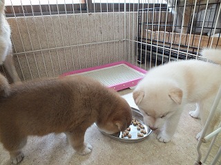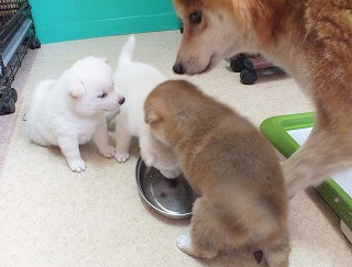 離乳食を始めています。子犬の残りをお母さんが全部食べてしまいます。